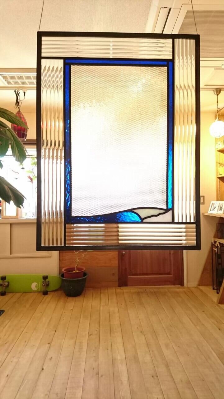 透明の型板ガラスの間を1周しているブルーのガラスは下部で波になっています。 さりげなく海を感じたい方などいかがでしょうか!! サイズ 縦:600㎜ 横:450㎜ 厚さ:約7㎜